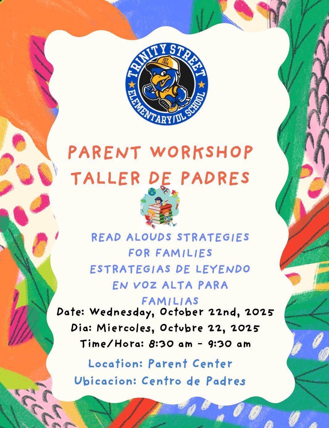 Date: Wednesday, October 22nd, 2025 Dia: Miercoles, Octubre 22, 2025 Time/Hora: 8:30 am - 9:30 am Location: Parent Center Ubicacion: Centro de Padres